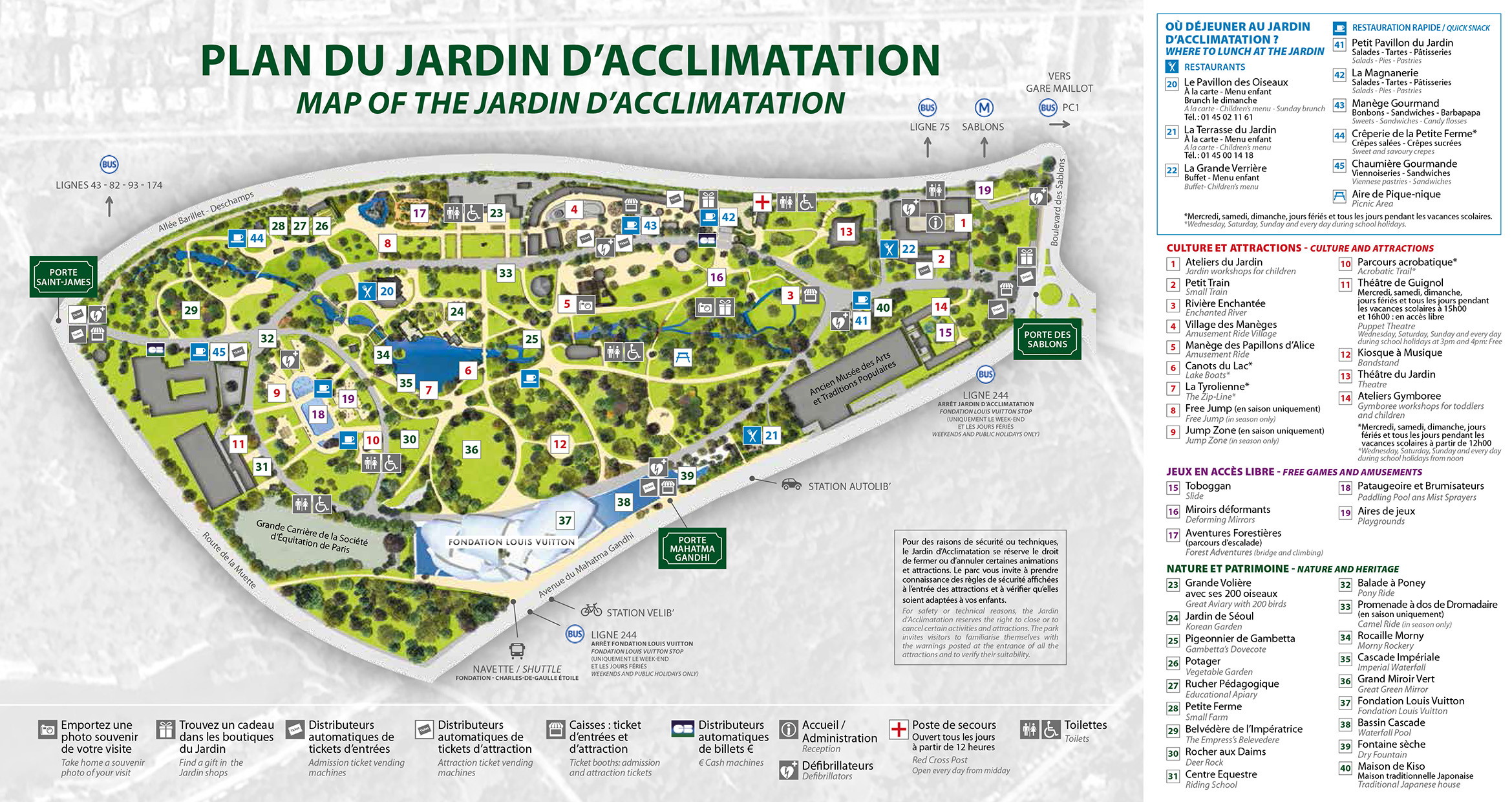 Inaugurated in Bois de Boulogne by Emperor Napoleon III in 1860, the Jardin d'Acclimatation consisted of greenhouses and a village hall covered with a large glass roof. The Jardin d'Acclimatation is now a family amusement park made up of 40 attractions. The view over the Fondation Louis Vuitton from Jardin d'Acclimatation is spectacular. Download printable map of Jardin d'Acclimatation.