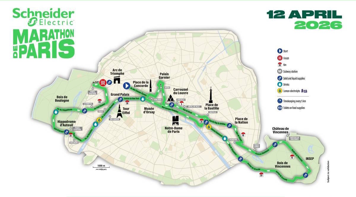 The starting line of the Marathon is in Champs-Elysées. Runners head downhill before passing through Place de la Concorde, Opéra Garnier and returning to Rue de Rivoli. The route then passes the Tuileries Gardens and Louvre Museum, goes round the Place de la Bastille and on to Boulevard Soult towards Bois de Vincennes. A wide loop in Bois de Vincennes returns runners to the heart of the city and Rue de Charenton, the halfway point.